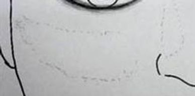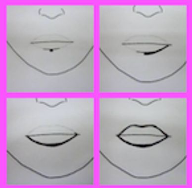Line the lips. Starting at the center of the bottom lip just OUTSIDE the natural lip draw toward the corners of the mouth, ending just INSIDE the natural lip. The upper lip is done similarly with the sides being just inside the natural lip and the “bow” drawn just above the natural lip. I try to not play with the shape of the upper lip too much.