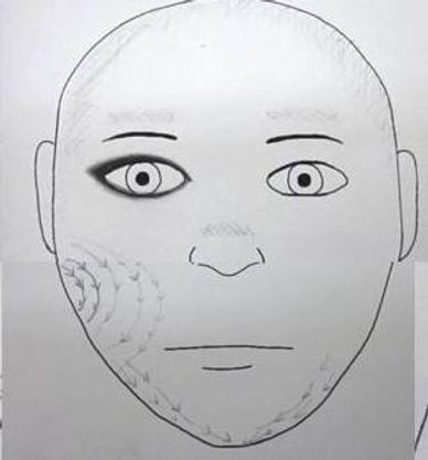 I use 2 different foundations. I use one that is lighter for the eye sockets, down to the cheekbones and outwards to just above the ears. I also use it across the top of the bridge of the nose to help highlight the brow ridge I have there that casts a little shadow. Essentially in the shape of a mask. I use the darker foundation on all of the rest of the face and neck, even going right over the top of the previously applied beard cover. After applying, I blend the two where they meet.